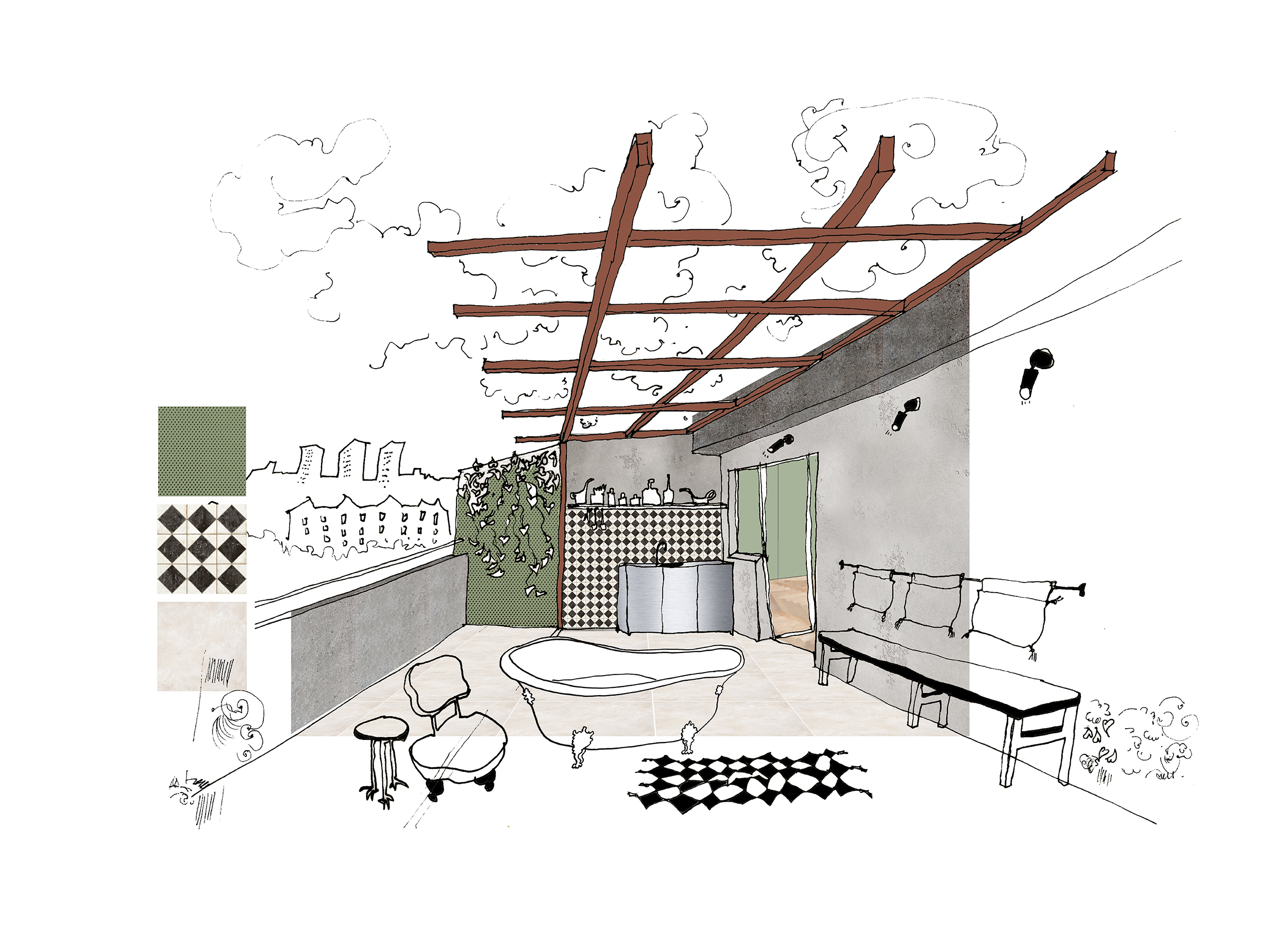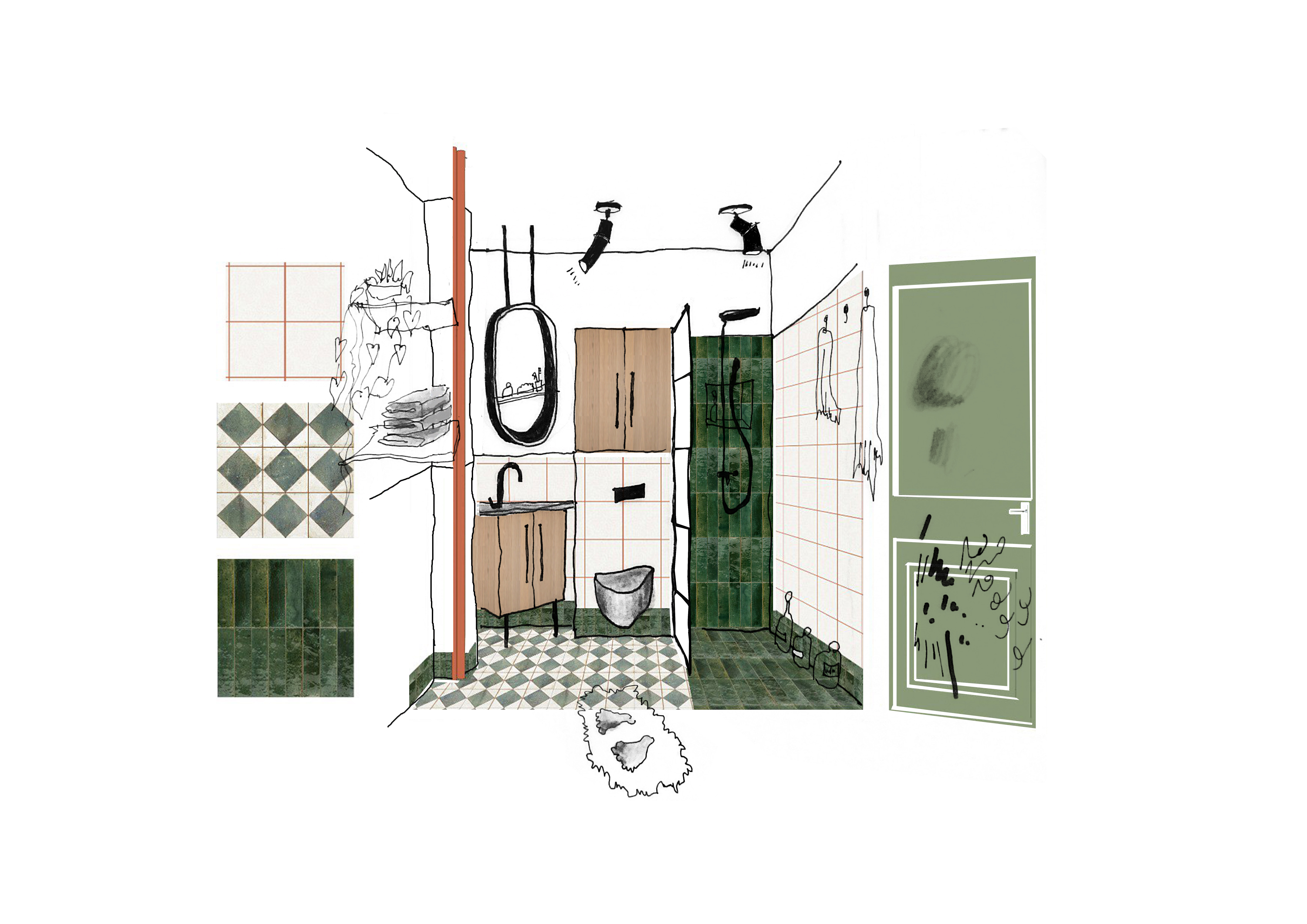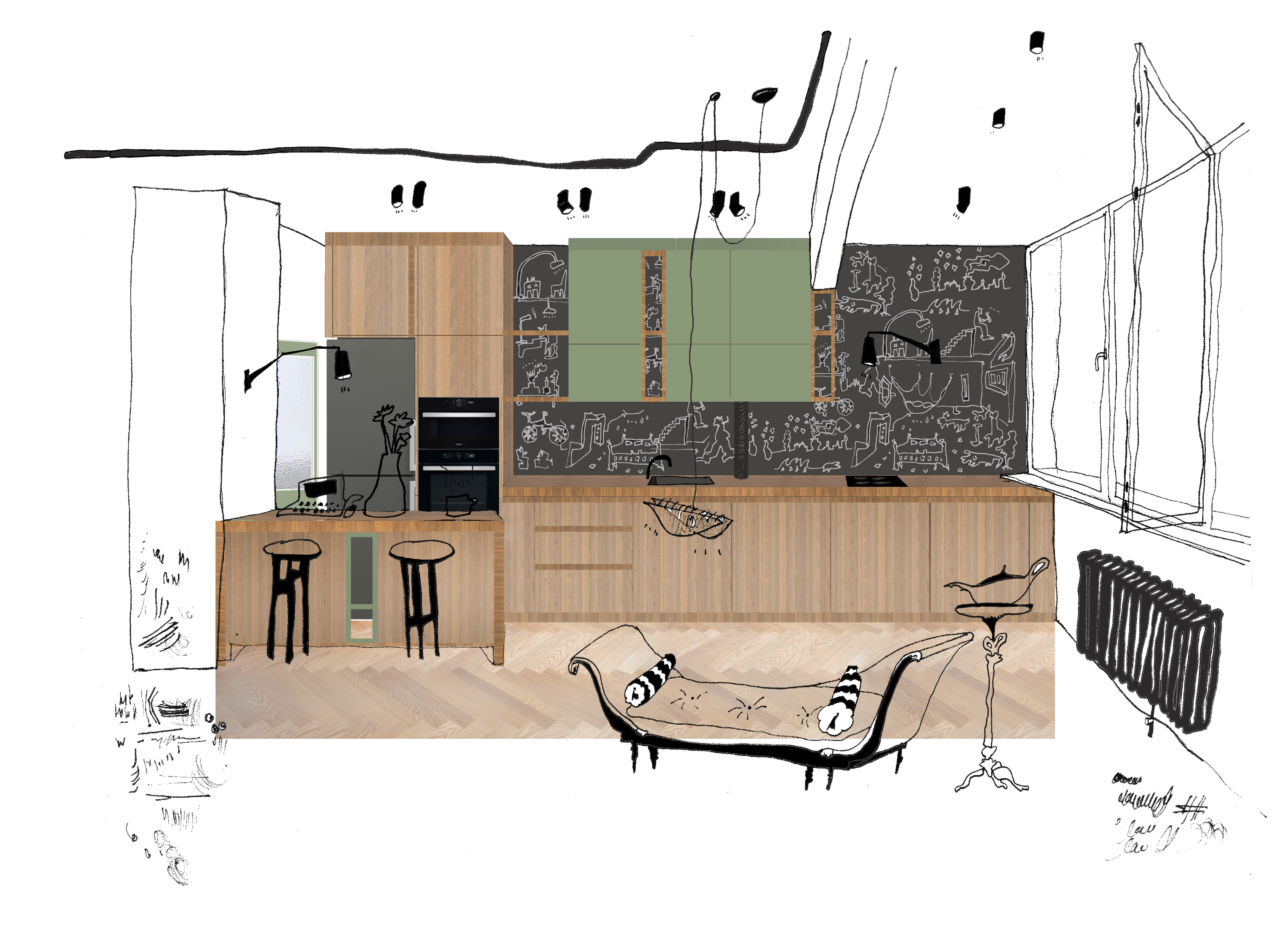 This is an ongoing project of the total refurbishment of an apartment in Block 8a in Belgrade. The initially segmented apartment has turned an open space project following the wishes of the client. The floor area of 60m2 is covered in natural oak herringbone parquet, with almost no partition walls. The kitchen and dining area as well as the living area are connected visually, and the future sleeping area is imagined to be separated by a moving partition. The client couldn’t decide between having a recammier sofa in the dining area or puffy chairs so we experimented with both options. As for the color pallette, we opted for some anthracite & white interior with some pale green doors and kitchen details. The backsplash kitchen wall will be handpainted white drawing on an antrhracite surface. The apartment is placed on an 11th floor and posseses a 20m2 balcony which is partially covered and roofed with glass panels. One of our first imaginations was for the terrace to hold an antique bath tub for the client to enjoy above the noisy city in the surroundings.