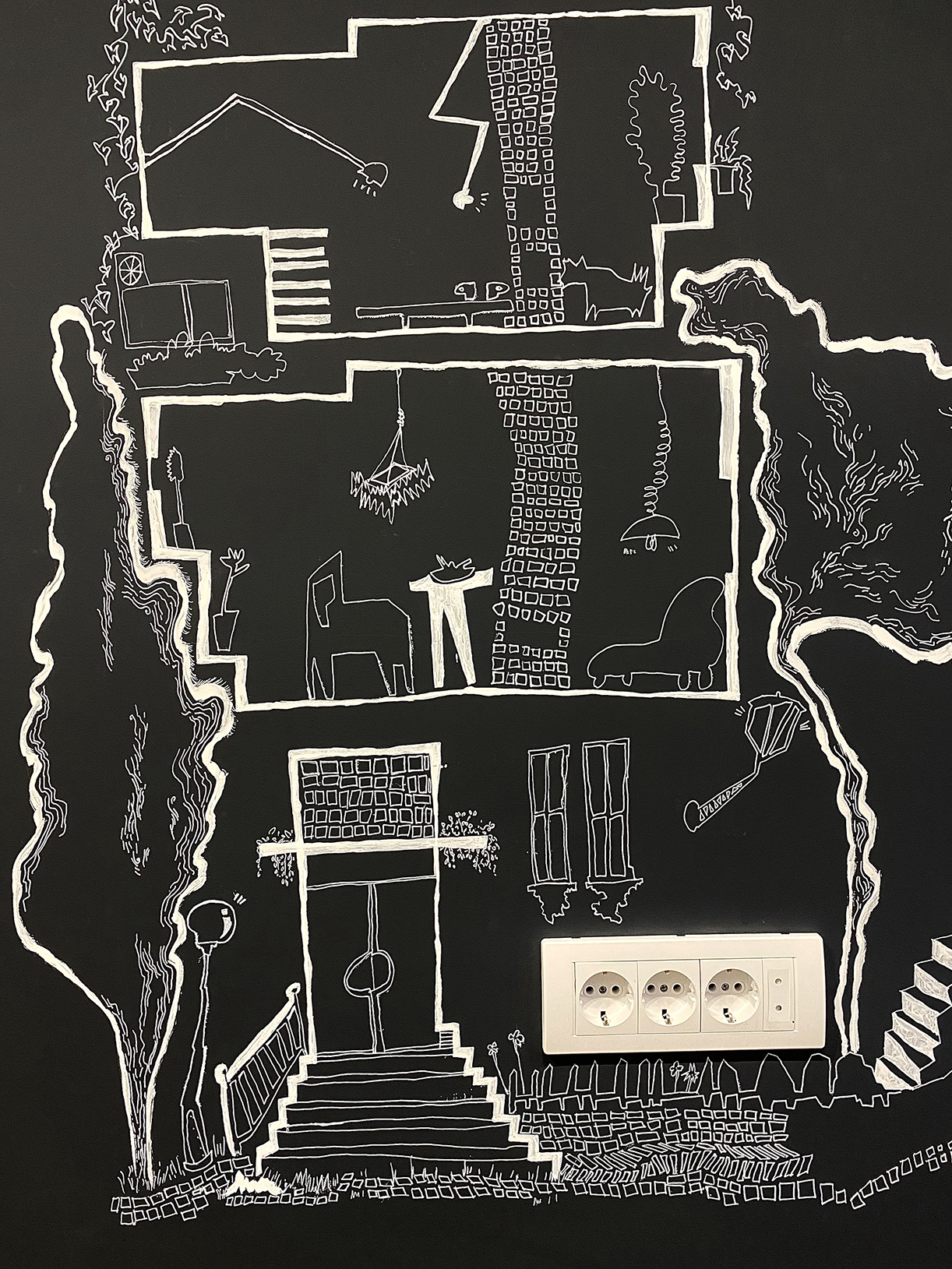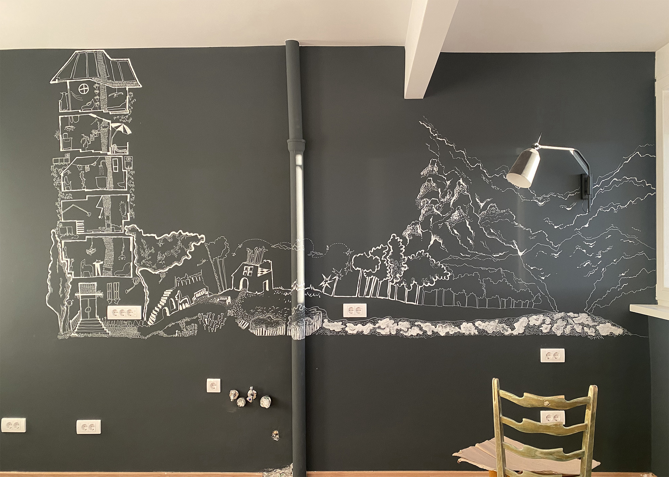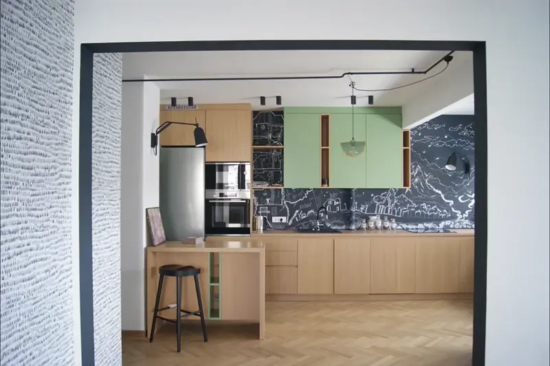 This is an ongoing project of the total refurbishment of an apartment in Block 8a in Belgrade. The initially segmented apartment has turned an open space project following the wishes of the client. The floor area of 60m2 is covered in natural oak herringbone parquet, with almost no partition walls. The kitchen and dining area as well as the living area are connected visually, and the future sleeping area is imagined to be separated by a moving partition. The client couldn’t decide between having a recammier sofa in the dining area or puffy chairs so we experimented with both options. As for the color pallette, we opted for some anthracite & white interior with some pale green doors and kitchen details. The backsplash kitchen wall will be handpainted white drawing on an antrhracite surface. The apartment is placed on an 11th floor and posseses a 20m2 balcony which is partially covered and roofed with glass panels. One of our first imaginations was for the terrace to hold an antique bath tub for the client to enjoy above the noisy city in the surroundings.