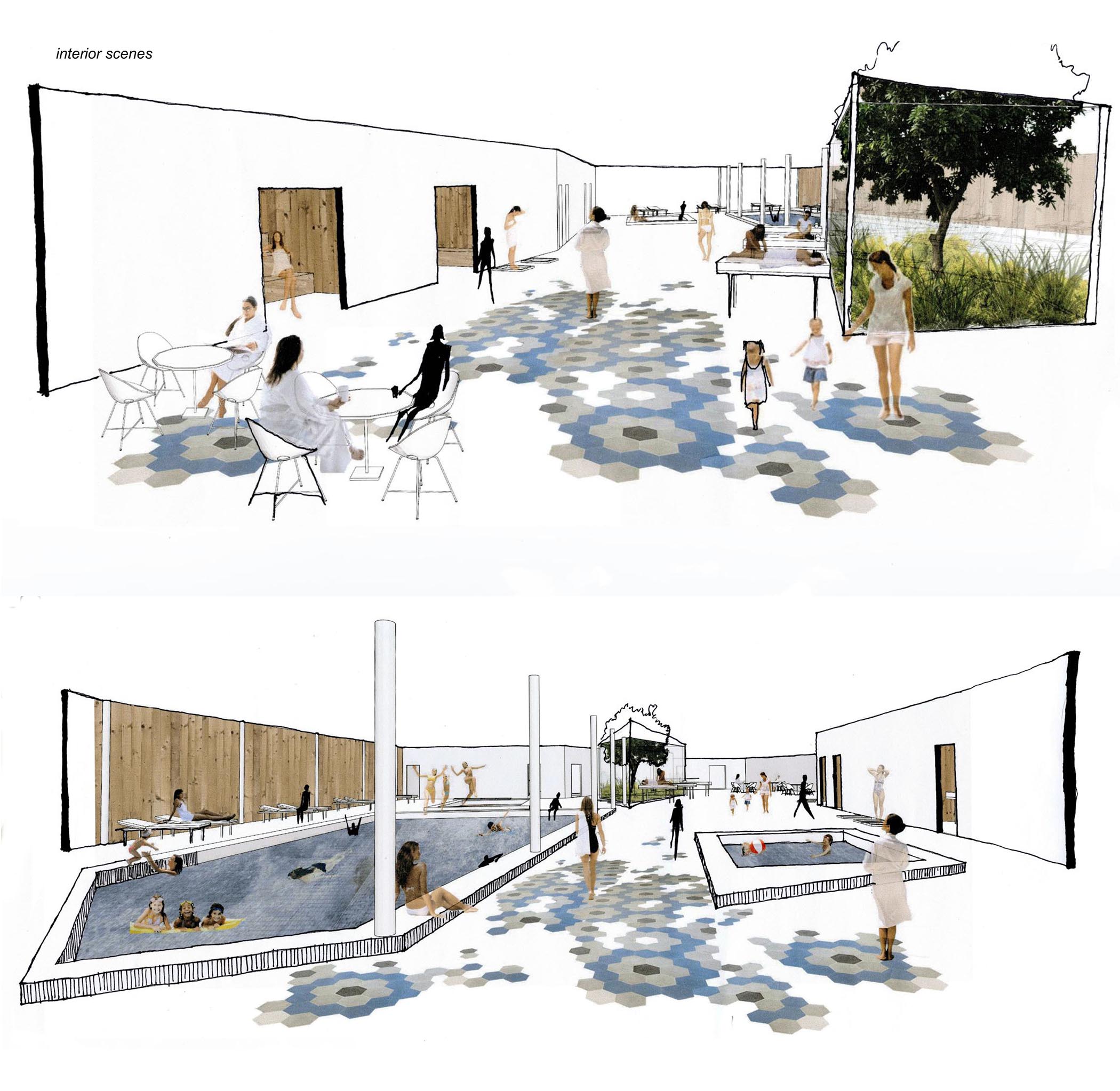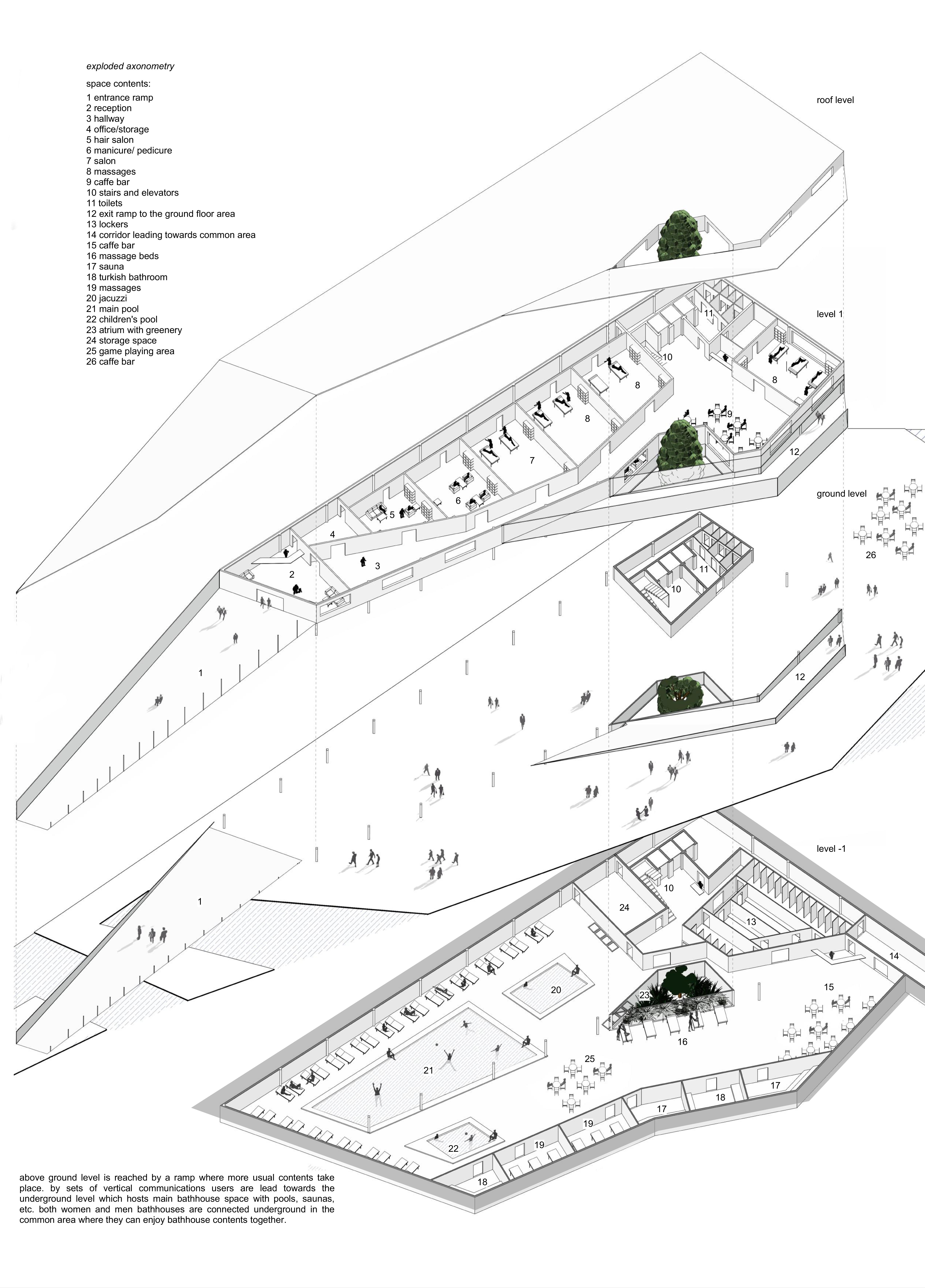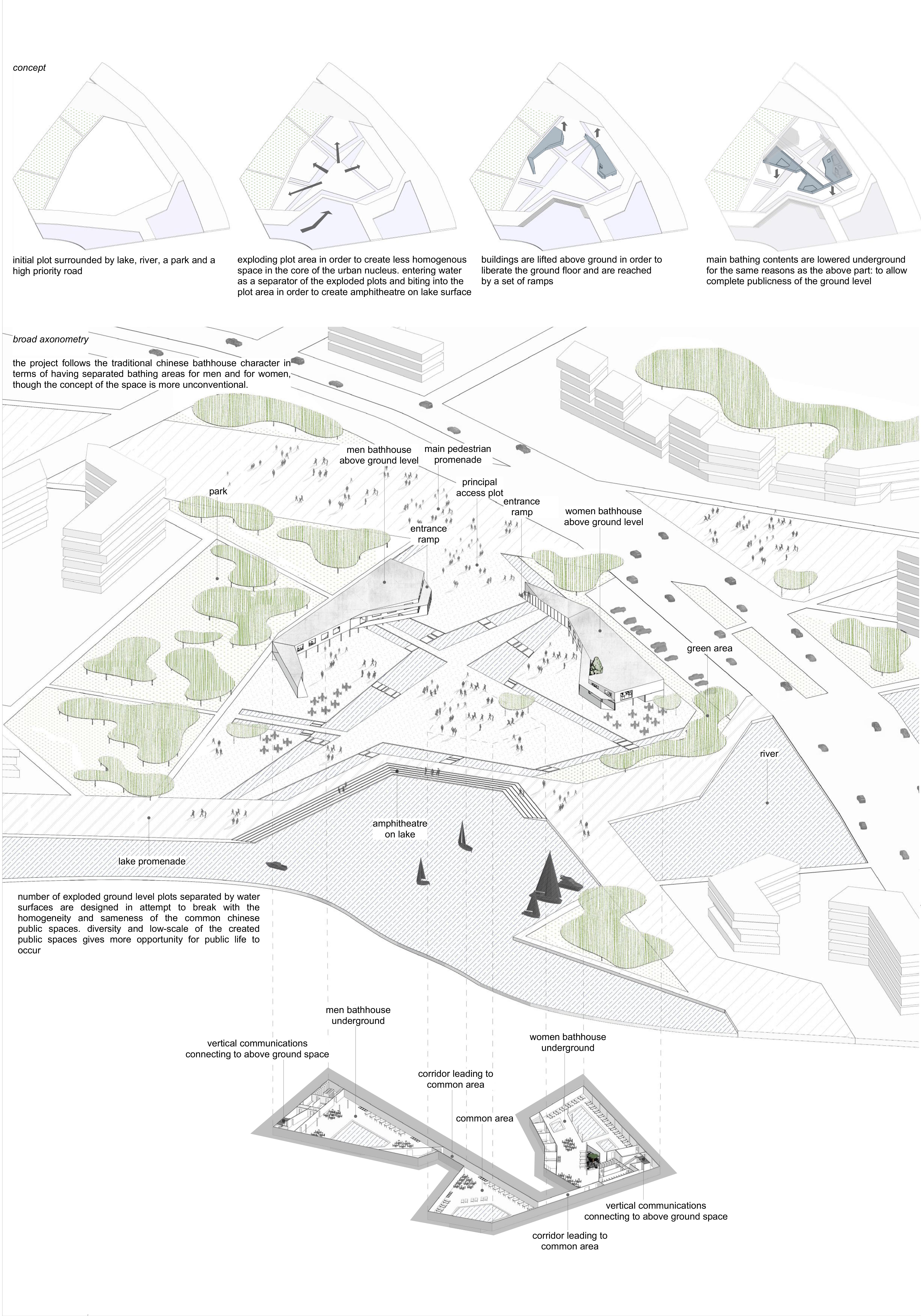 This project is an outcome of the group project on urban planning in a new part of a town in Chengdu where an artificial lake is created and the city is concentrated around it. The public bathhouse project comes out as an individual project tackling the limits and usage of public spaces in Chinese cities, and the architecture that shapes them. In this project the water breaks the plots where the bathhouse buildings are placed. The reason for this outcome is to avoid the situation where one building dominates a square, but break the whole area into smaller plots in order to achieve a more human-scale sized built environment and gain an easier accessibility for all users.