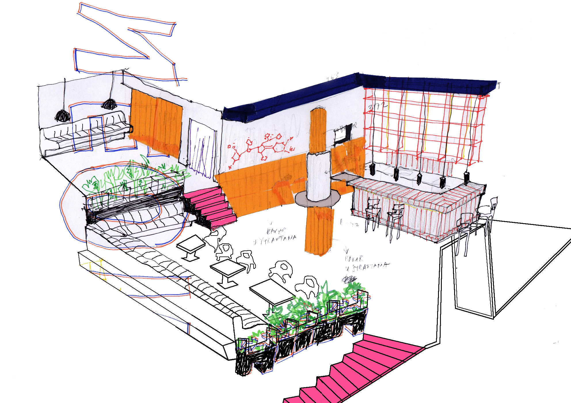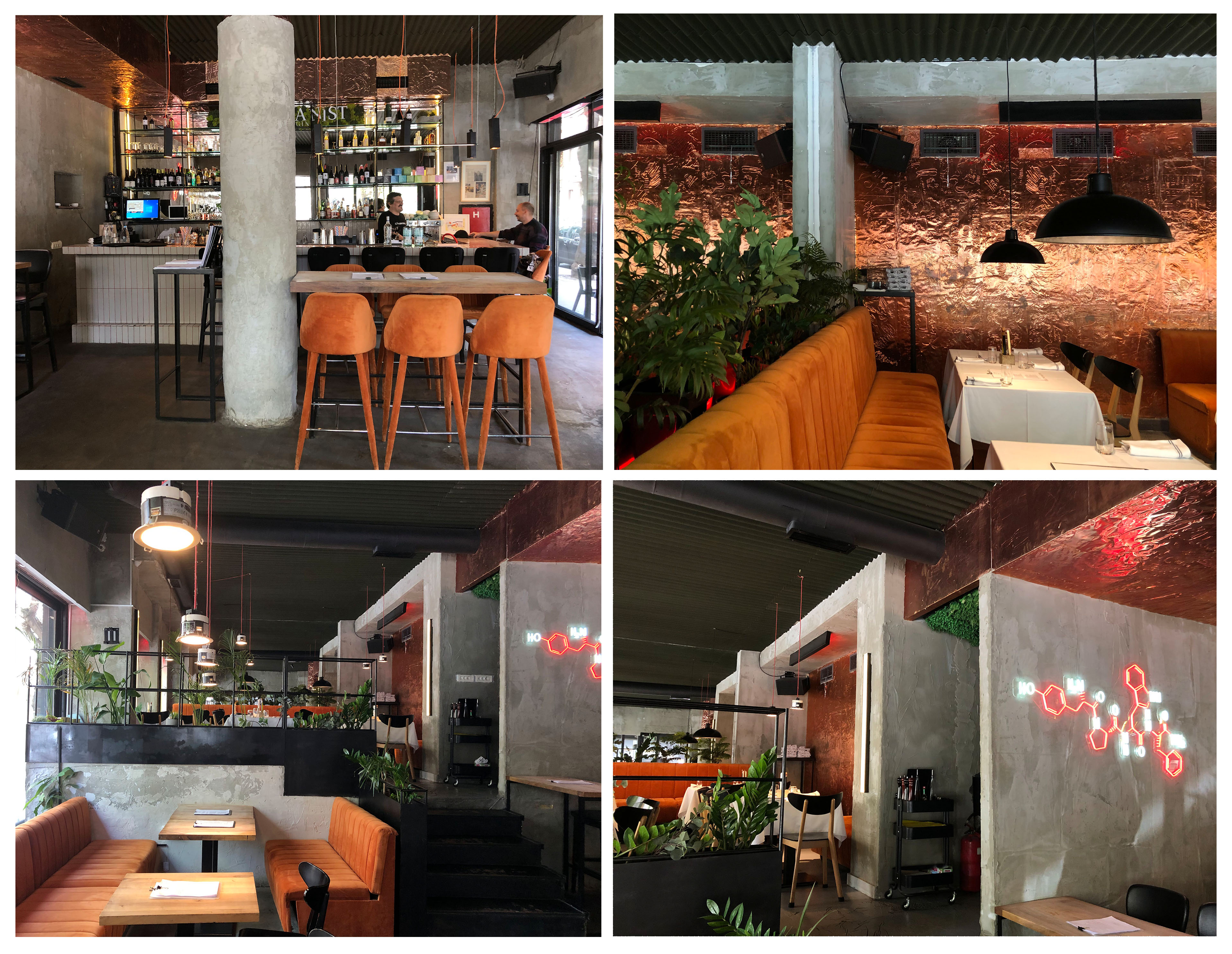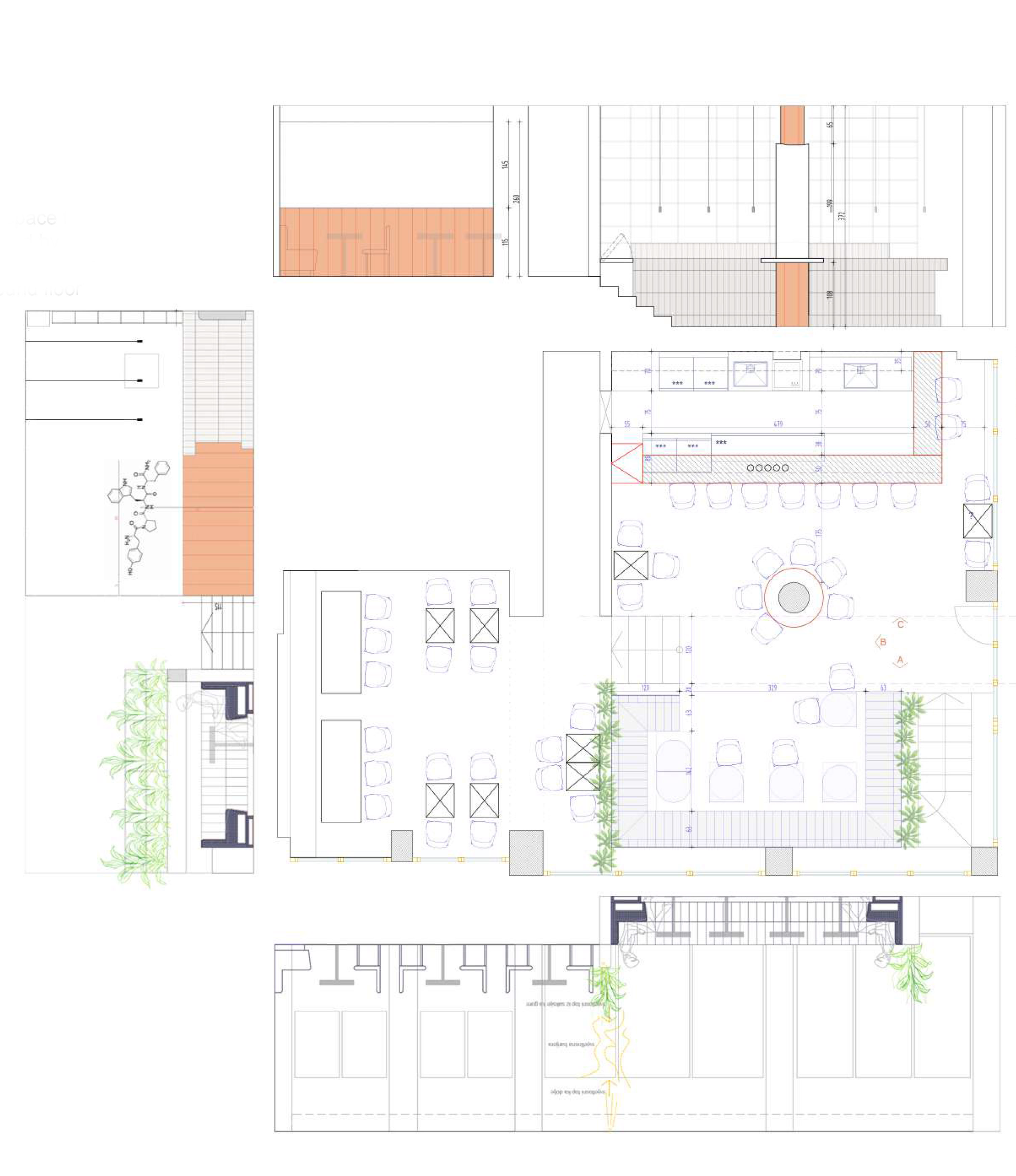 A friend asked a group of friends to help him reconstruct and readapt the space of his bar and restaurant. Finances and time were very narrow and strict, we had to reuse a lot of elements from the previous space and the place had to reopen in a very short amount time. The position of the bar shifted to be parallel to the back wall in order to free up the space for chatting, dancing. Low and relaxing seating area was achieved by introducing new orange seating, making this lower part of the restaurant relaxed in character. The whole space was divided to host a fine dining zone in the upper part of the ground floor. The barrier between two zones was achieved by planting some plants in the black metal pots, creating a see-through barrier but without blocking the sight between two zones of the restaurant. Using low-cost materials found in a local building supply store was helpful financially but also created interesting visual effects. One of them is the green undulating plates originally used for roofing, and now acting as the cover for the old ceiling which was in ruins. Another material we used are thin copper sheets to cover larger areas of walls and some parts of gypsum ceiling, adding the visually stunning effect to the whole space. We drew on all of the copper sheets with whatever we could find to create imprints, in order to give a personal touch to this design decision. Some of the old metal lamps were readjusted to serve as lighting above the bar. The pink and red LED lights were used as an easy fix for creating a visual change but with spending less.