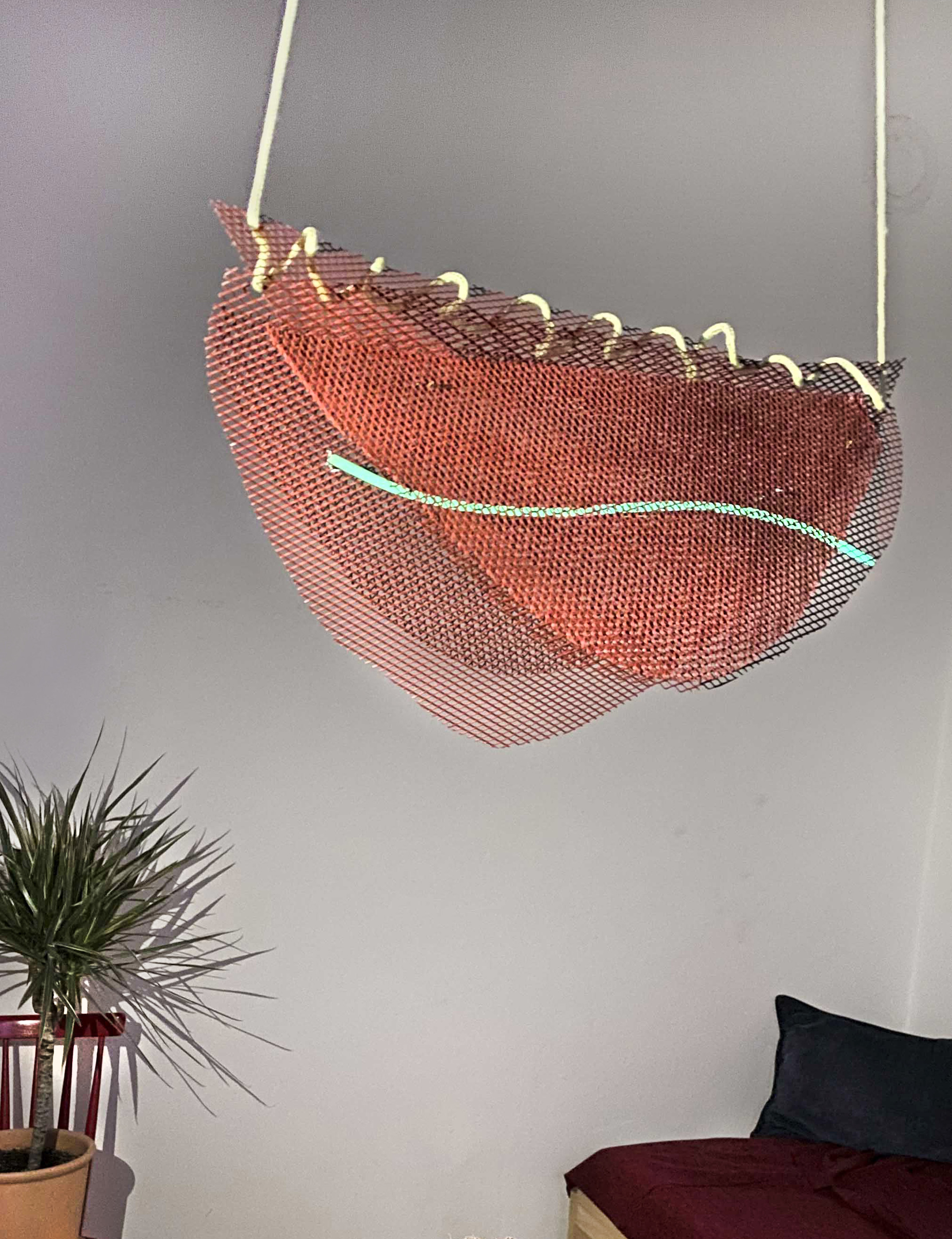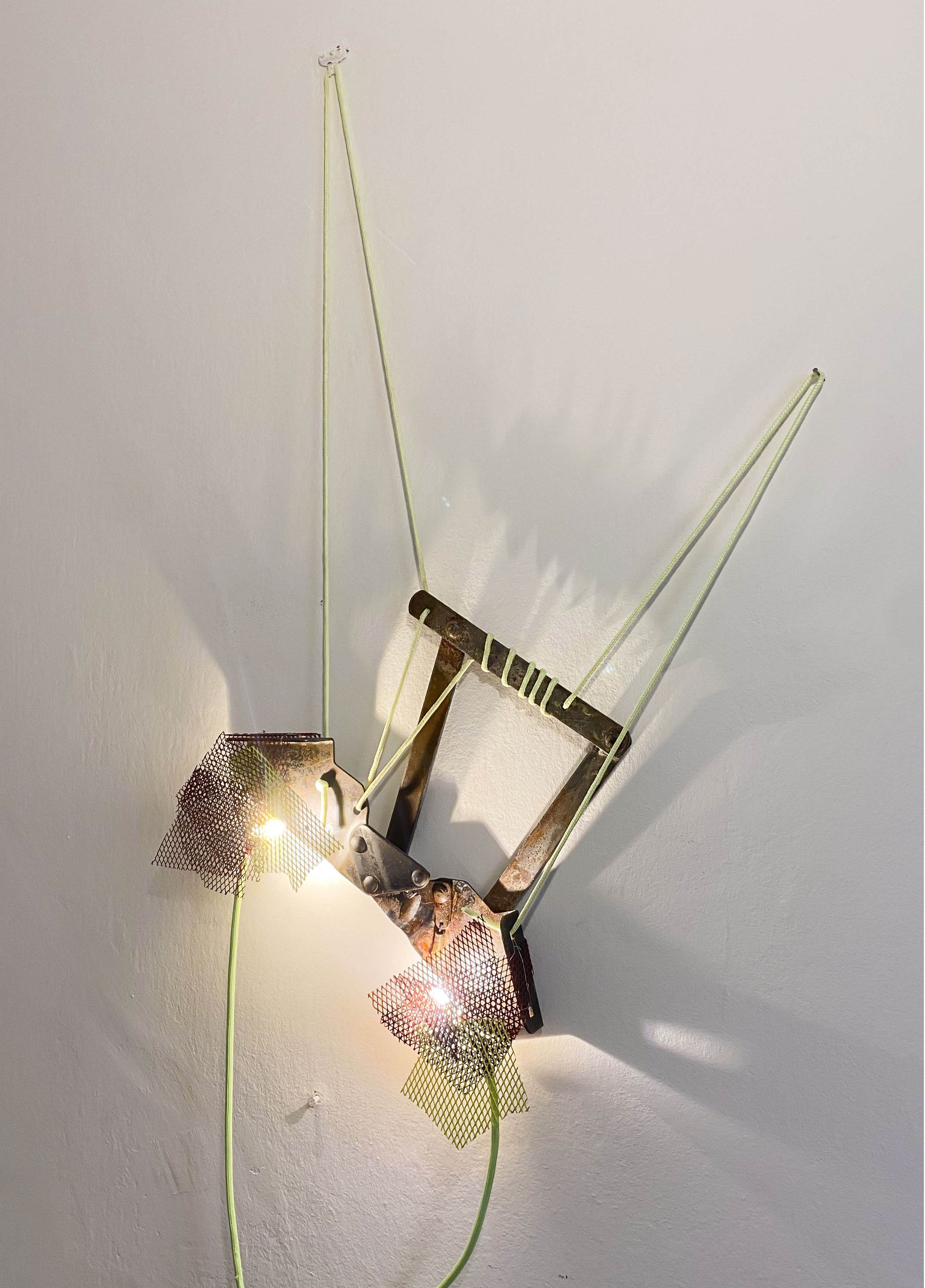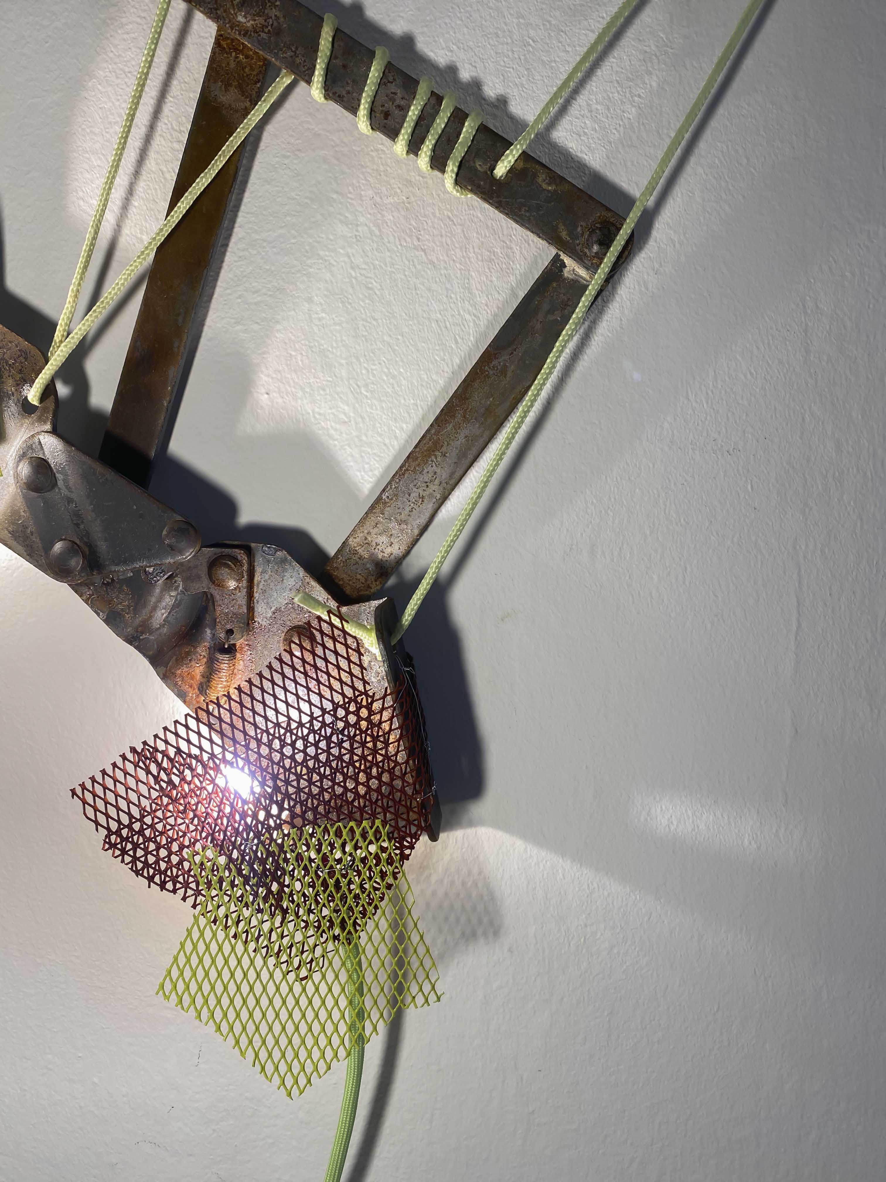 The project ‘Light traps’ is a collection of lighting objects created during July 2023. The name of the collection comes from the visual and symbolic inspiration found in the natural world of carnivorous plants and sea jellies. This idea was born out of the personal inclination towards re-purposing discarded materials or objects. And also due to a limited choice when it comes to lighting design supply in the Balkan region. Metals found near metal waste, materials like metal mesh and textile ropes are all used to create lighting objects which demonstrate what can be achieved with little investment and with giving new life to waste.